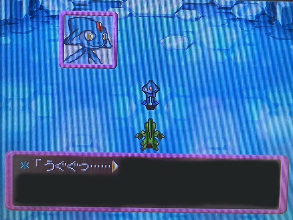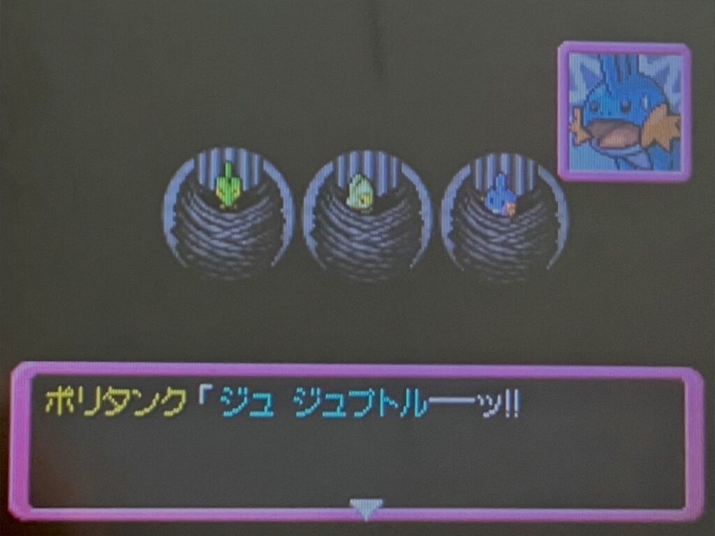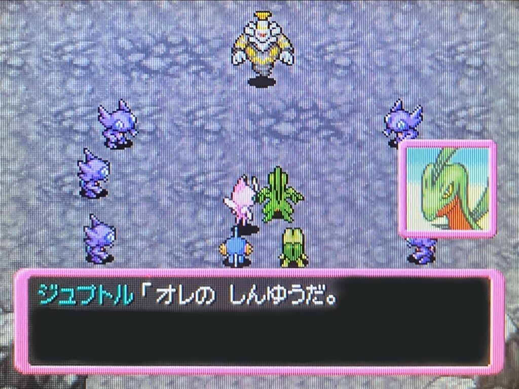 ここのジュプトルとの戦闘はポリタンクくんのとっしんだけで撃破されてました。相棒が頼もしすぎます。相性の補完も優れていて完璧なパーティです。